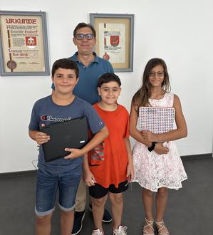 In dieser Woche haben mich drei Kinder der Niko-Klasse (4. Schuljahr) unserer Grundschule im Rathaus besucht. Nesrin, Wael und Davide wurden von ihrer Klassenlehrerin, Frau Daub, begleitet. Die Drei führten ein Interview für die Schülerzeitung mit mir. Fragen wie „Wie war Ihre eigene Schulzeit?“, „Gab es auch mal Strafarbeiten?“, nach meinen Lieblings- bzw. Hassfächern oder „Was wollten Sie eigentlich mal werden?“ brachten mich an diesem heißen Sommertag noch mehr zum Schwitzen. „Wieviel verdient ein Bürgermeister“ oder „Was waren die peinlichsten Momente in ihrer bisherigen Amtszeit?“ kamen ebenfalls zur Sprache. Zum Schluss gab es noch ein kleines Dankeschön für die Sicherheit auf dem Schulweg sowie das obligatorische Foto.