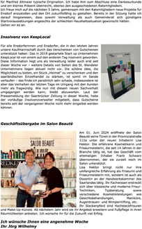 Für alle Ensdorferinnen und Ensdorfer, die in den letzten Jahren unsere Kaufmannschaft durch das Verschenken von Gutscheinen unterstützt haben: Das in 2019 gestartete Start up Unternehmen KeepLocal ist von einem auf den anderen Tag insolvent geworden. Diese Information liegt uns als Verwaltung leider auch erst seit dieser Woche vor – weitere Details von Seiten des St. Wendeler Unternehmens liegen aktuell nicht vor. Die schöne Idee, die Möglichkeit zu bieten, ein Stück „Heimat“ zu verschenken und den saarländischen Einzelhandel zu stärken, ist somit im Sande verlaufen – das finde ich persönlich sehr schade, insbesondere ist aber das Verhalten der letzten Tage im Umgang mit den Kunden mehr als fragwürdig. Wie nun mit diesem neuen Sachverhalt umgegangen werden kann, bleibt abzuwarten. Laut der Pressemeldung der Saarbrücker Zeitung in dieser Woche, habe der vorläufige Insolvenzverwalter mitgeteilt, dass Gutscheine bereits seit der vergangenen Woche nicht mehr eingelöst werden können.