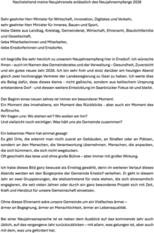 ich begrüße Sie sehr herzlich zu unserem Neujahrsempfang hier in Ensdorf. Ich wünsche Ihnen – auch im Namen des Gemeinderates und der Verwaltung – Gesundheit, Zuversicht und ein gutes neues Jahr 2026. Ich bin sehr froh und stolz darüber am heutigen Abend gleich zwei hochrangige Vertreter der Landesregierung zu Gast zu haben. Ich werte dies als Beleg dafür, dass dieses kleine - nicht gallische, sondern aus keltischem Ursprung entstandene Dorf - und dessen weitere Entwicklung im Saarbrücker Fokus ist und bleibt.
