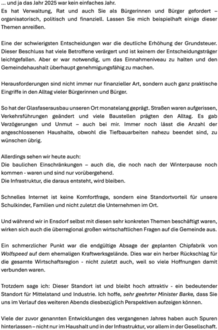 Mein Rat: Wer Optimismus sucht, sollte weniger nach Berlin schauen und öfter ins nächste Rathaus gehen. Da wird nicht geunkt, da wird gemacht. Und genau deshalb entsteht Zukunft nicht in Strategiepapieren, sondern zwischen Bürgermeister, Kämmerin, Bauamt, Gemeinderat und Bürger. Kurz gesagt: Hoffnung hat eine Postleitzahl.“