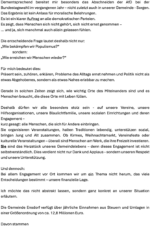 Dementsprechend bereitet mir besonders das Abschneiden der AfD bei der Bundestagswahl im vergangenen Jahr – nicht zuletzt auch in unserer Gemeinde - Sorgen.