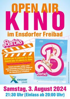 Der Film „Barbie“ hat eine FSK-Freigabe ab 6 Jahren. Der Eintritt zum Kino-Open-Air kostet 5,00 Euro pro Person. Kinder bis zur Vollendung des 12. Lebensjahres zahlen einen ermäßigten Eintrittspreis von 3,00 Euro. Die Tickets können im Vorverkauf an der Freibadkasse oder im Ticket-Onlineshop unter www.gemeinde-ensdorf.de erworben werden. Der Erwerb an der Abendkasse ist ebenfalls möglich, jedoch ist die Anzahl der Tickets begrenzt.