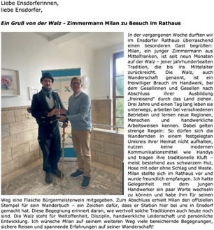 In der vergangenen Woche durften wir im Ensdorfer Rathaus überraschend einen besonderen Gast begrüßen: Milan, ein junger Zimmermann aus Mittelfranken, ist seit neun Monaten auf der Walz – jener jahrhundertealten Tradition, die bis ins Mittelalter zurückreicht. Die Walz, auch Wanderschaft genannt, ist ein freiwilliger Brauch im Handwerk, bei dem Gesellinnen und Gesellen nach Abschluss ihrer Ausbildung „freireisend“ durch das Land ziehen. Drei Jahre und einen Tag lang leben sie unterwegs, arbeiten bei verschiedenen Betrieben und lernen neue Regionen, Menschen und handwerkliche Arbeitsweisen kennen. Dabei gelten strenge Regeln: So dürfen sich die Wandernden in einem festgelegten Umkreis ihrer Heimat nicht aufhalten, nutzen keine modernen Kommunikationsmittel wie Handys und tragen ihre traditionelle Kluft – meist bestehend aus schwarzem Hut, Hose mit oder ohne Schlag und Weste. Milan stellte sich im Rathaus vor und wurde freundlich empfangen. Ich hatte Gelegenheit mit dem jungen Handwerker ein paar Worte wechseln zu können und habe ihm für seinen Weg eine Flasche Bürgermeisterwein mitgegeben. Zum Abschluss erhielt Milan den offiziellen Stempel für sein Wanderbuch – ein Zeichen dafür, dass er Station hier bei uns in Ensdorf gemacht hat. Diese Begegnung erinnert daran, wie wertvoll solche Traditionen auch heute noch sind. Die Walz steht für Weltoffenheit, Disziplin, handwerkliche Leidenschaft und persönliche Entwicklung. Ich wünsche Milan auf seinem weiteren Weg viele bereichernde Begegnungen, sichere Reisen und spannende Erfahrungen auf seiner Wanderschaft!