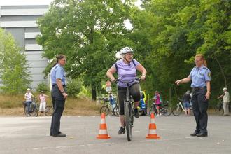 Nach einer kurzen theoretischen Einführung durch Polizeikommissarin Kerstin Knips standen wieder verschiedene Übungen auf dem Programm. Es wurde trainiert richtig anzufahren, zu bremsen und in Kurven zu fahren. Dazu fanden auch Koordinations- und Geschicklichkeitsübungen an Parcours mit Pylonen und Absperrbändern statt. Polizeikommissarin Kerstin Girlinger unterstützte Frau Knips bei dem Fahrtraining. Die Absolventen wurden zum Ende des Trainings auf ihrem E-Bike immer sicherer. Alle waren von dem Fahrsicherheitskurs begeistert und der eine oder andere kündigte schon an, eines der künftig angebotenen Kurse für den letzten Feinschliff zu besuchen. Übrigens war der älteste Teilnehmer stolze 92 Jahre alt!