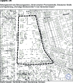 Vorrangiges Ziel des Bebauungsplanes ist es daher, die teils denkmalgeschützten und ortsbildprägenden Gebäudestrukturen des Bereiches „Ehemalige Direktorenvillen“ und des Umfeldes zwischen Provinzialstraße, Griesborner Straße und Kapellenweg im Bestand zu sichern und somit die Beeinträchtigung der vorhandenen städtebaulichen Quartiersstruktur zu vermeiden. Hierzu ist beabsichtigt, aus dem prägenden baulichen Bestand des Viertels insbesondere Festsetzungen hinsichtlich des Maßes der baulichen Nutzung, der Bauweise sowie der überbaubaren Grundstücksflächen abzuleiten. Dazu ist es notwendig, die relativ weiten Grenzen des „Einfügens“ nach § 34 BauGB durch einen Bebauungsplan bedeutend feiner zu steuern. Bedingt durch die Genehmigungspraxis des letzten Jahrzehntes zeigt sich die Entwicklung hin zu weiterer innerörtlicher Verdichtung.