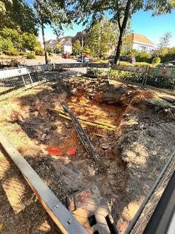 Diese Woche wurde vor dem Bergmannsheim ein Kopfloch gegraben, um die notwendigen Reparaturarbeiten vorzunehmen zu können.