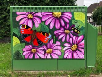 Auf der anderen Seite wollen die Gemeinderatsmitglieder und das Verwaltungsteam unseren Ort schöner und l(i)ebenswert(er) gestalten. Im Zuge des Atmochecks ist ein weiterer trister, grauer Verteilerkasten nun zu einem echten Hingucker geworden. Bunte Schmetterlinge, Blumen und Blätter zieren den ehemals trostlos aussehenden Kasten im Amselweg.