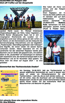 Einen Regisseur, der in Verona die AIDA aufführt und im nächsten Jahr auf dem Haldenplateau unserer kleinen Gemeinde die ZAUBERFLÖTE: Stefano Poda. Gemeinsam mit dem Ideengeber Joachim Arnold (Musik & Theater Saar), Landrat Patrik Lauer, Dr. Michael Drobniewski (Regionalbeauftragter der RAG), Volker Hagelstein und Martin Becker (Bergbauerbe Saar) hat er sich am vergangenen Wochenende die Location vor Ort angesehen (und zwar nahezu genau ein Jahr vorher und am Abend, um den Sonnenstand und den Zeitpunkt des Sonnenuntergangs mitzunehmen) und war begeistert. „Theaterzauber, Überwältigungstheater oder Volksoper“ sind Begriffe, die immer wieder mit seinem Namen verbunden werden. Dieser besondere Ort mit der Landmarke hat den bekannten Regisseur bereits jetzt fasziniert und wir dürfen alle gespannt sein, mit welchen Ideen er die „Zauberflöte“ am Saarpolygon im nächsten Jahr inszenieren wird. Der Kartenvorverkauf steht in den Startlöchern und ist für November 2023 geplant. Ich freue mich mit Ihnen auf August 2024 – es wird grandios!