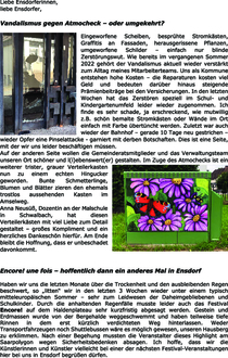 Eingeworfene Scheiben, besprühte Stromkästen, Graffitis an Fassaden, herausgerissene Pflanzen, umgeworfene Schilder – einfach nur blinde Zerstörungswut. Wie bereits im vergangenen Sommer 2022 gehört der Vandalismus aktuell wieder verstärkt zum Alltag meines Mitarbeiterteams. Uns als Kommune entstehen hohe Kosten – die Reparaturen kosten viel Geld und bedeuten darüber hinaus steigende Prämienbeiträge bei den Versicherungen. In den letzten Wochen hat das Zerstören speziell im Schul- und Kindergartenumfeld leider wieder zugenommen. Ich finde es sehr schade, ja erschreckend, wie mutwillig z.B. schön bemalte Stromkästen oder Wände im Ort einfach mit Farbe übertüncht werden. Zuletzt war auch wieder der Bahnhof – gerade 10 Tage neu gestrichen –wieder Opfer eine Pinselattacke - garniert mit derben Botschaften. Dies ist eine Seite, mit der wir uns leider beschäftigen müssen.