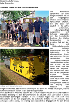 Dank des frischen Anstrichs erstrahlt die Lok nun wieder in neuem Glanz und bleibt ein beliebter Blickfang vor dem Bergmannsheim. Sie ist jetzt schon von weitem in einem leuchtenden Sonnengelb sichtbar. In den nächsten Tagen wird auch noch eine Hinweistafel an der Lok angebracht, die technische Details von ihr preisgibt. Die gelungene Aktion zeigt, wie wichtig bürgerschaftliches Engagement für den Erhalt unseres kulturellen Erbes ist. Mein Dank geht neben den fleißigen Helfern des Berg- und Hüttenarbeitervereins (Frank Bauman, Günter Felten, Frank Hassel, Bernhard Käfer, Gehard Stephany, Raimund Weiler) ebenfalls an die Firma Farben Huffer und an Maler Linn aus Fraulautern, der aus früherer bergmännischer Verbundenheit den Helfern mit Rat und Tat zur Seite stand.