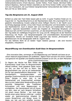 Zu Beginn der Woche hat Maik Färber die Eventlocation Gudd Gess im Bergmannsheim offiziell eröffnet. Viele geladene Gäste waren vor Ort, um dies mit ihm zu feiern. Das Bergmannsheim war und ist ein bedeutender Ort für das gesellschaftliche Miteinander – für Familienfeiern, Vereinsaktivitäten und gesellige Zusammenkünfte im Herzen unseres Ortes. Gerade in einer Zeit, in der Gemeinschaft und Zusammenhalt wichtiger denn je sind, bietet diese Wiedereröffnung eine wertvolle Gelegenheit, alte Traditionen fortzusetzen und neue Begegnungen zu ermöglichen. Der Gemeinderat und ich freuen uns sehr, dass wir nach längerer Schließzeit mit einem neuen Pächter – der noch dazu bereits einen guten Namen mitbringt – endlich wieder ein gastronomisches Angebot für unsere Bürgerinnen und Bürger sowie für Gäste von nah und fern schaffen konnten. Zusammen hoffen wir, dass viele Menschen diesen Ort mit Leben füllen und gemeinsam schöne Stunden verbringen.