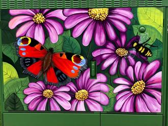 Anna Neusüß, Studentin und talentierte Hobbymalerin, unterbreitete der Verwaltung das Angebot, den Verteilerkasten in ihrer Wohnstraße, dem Amselweg, kostenlos zu gestalten. Lediglich die Arbeitsmaterialien (Platte, Pinsel und Farben) sollten zur Verfügung gestellt werden. Auch das vorgeschlagene Motiv – farbenfrohe Blüten und Insekten – hat uns auf Anhieb begeistert. Vielen Dank für das Engagement!
