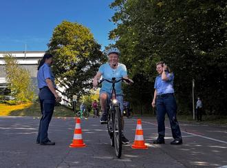 Auch Reporter Florian Possinger ließ es sich nicht nehmen, den Parcours selbst zu absolvieren und sein Können im Rahmen einer Live-Schalte im ARD Mittagsmagazin unter Beweis zu stellen. Unter den wachsamen Augen der Polizeioberkommissarinnen Kerstin Knips und Kerstin Girlinger meisterte er alle gestellten Aufgaben mit Bravour.