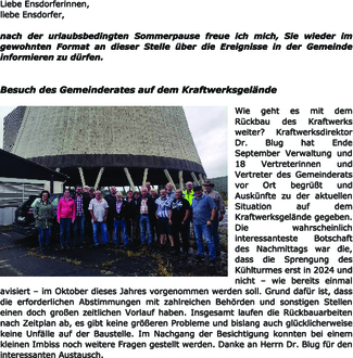 Wie geht es mit dem Rückbau des Kraftwerks weiter? Kraftwerksdirektor Dr. Blug hat Ende September Verwaltung und 18 Vertreterinnen und Vertreter des Gemeinderats vor Ort begrüßt und Auskünfte zu der aktuellen Situation auf dem Kraftwerksgelände gegeben. Die wahrscheinlich interessanteste Botschaft des Nachmittags war die, dass die Sprengung des Kühlturmes erst in 2024 und nicht – wie bereits einmal avisiert – im Oktober dieses Jahres vorgenommen werden soll. Grund dafür ist, dass die erforderlichen Abstimmungen mit zahlreichen Behörden und sonstigen Stellen einen doch großen zeitlichen Vorlauf haben. Insgesamt laufen die Rückbauarbeiten nach Zeitplan ab, es gibt keine größeren Probleme und bislang auch glücklicherweise keine Unfälle auf der Baustelle. Im Nachgang der Besichtigung konnten bei einem kleinen Imbiss noch weitere Fragen gestellt werden. Danke an Herrn Dr. Blug für den interessanten Austausch.