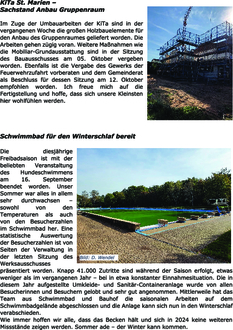 Die diesjährige Freibadsaison ist mit der beliebten Veranstaltung des Hundeschwimmens am 16. September beendet worden. Unser Sommer war alles in allem sehr durchwachsen – sowohl von den Temperaturen als auch von den Besucherzahlen im Schwimmbad her. Eine statistische Auswertung der Besucherzahlen ist von Seiten der Verwaltung in der letzten Sitzung des Werksausschusses präsentiert worden. Knapp 41.000 Zutritte sind während der Saison erfolgt, etwas weniger als im vergangenen Jahr – bei in etwa konstanter Einnahmesituation. Die in diesem Jahr aufgestellte Umkleide- und Sanitär-Containeranlage wurde von allen Besucherinnen und Besuchern gelobt und sehr gut angenommen. Mittlerweile hat das Team aus Schwimmbad und Bauhof die saisonalen Arbeiten auf dem Schwimmbadgelände abgeschlossen und die Anlage kann sich nun in den Winterschlaf verabschieden.