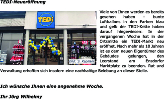 Viele von Ihnen werden es bereits gesehen haben – bunte Luftballons in den Farben blau und gelb der TEDI-Kette haben darauf hingewiesen: In der vergangenen Woche hat in der Ortsmitte ein TEDI-Markt neu eröffnet. Nach mehr als 10 Jahren ist es dem neuen Eigentümer des Gebäudes gelungen, den Leerstand am Ensdorfer Marktplatz zu beenden. Rat und Verwaltung erhoffen sich insofern eine nachhaltige Belebung an dieser Stelle.