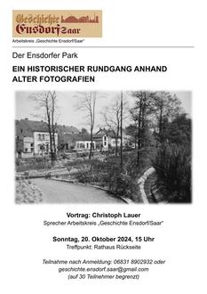 Am Sonntag, den 20. Oktober findet ab 15 Uhr ein historischer Rundgang im Ensdorfer Park statt, bei dem anhand alter Fotografien die Geschichte und Entwicklung des Parks nachgezeichnet wird. Treffpunkt ist hinter dem Rathaus. Geleitet wird der Rundgang vom Sprecher des historischen Arbeitskreis Ensdorf, Christoph Lauer. Vom Rathaus aus geht es über den Bunker und den Mundstollen zum Gedenkstein des ehemaligen Exerzitienhauses. Als Highlight der Tour besichtigen wir am Ende den Felsenkeller in der Prälat-Anheier-Straße, der normalerweise nicht für die Öffentlichkeit zugänglich ist. Der Rundgang dauert ca. eine Stunde. Die Teilnahme ist kostenlos, aber es wird um Anmeldung gebeten, da die Teilnehmerzahl aufgrund der Besichtigung des Felsenkellers auf 30 Personen beschränkt ist. Anmelden können Sie sich unter 06831 8902932 (bitte ggf. auf den Anrufbeantworter sprechen) oder unter geschichte.ensdorf.saar@gmail.com. Sollten weitaus mehr als 30 Anmeldungen zustande kommen, wird noch ein zweiter Termin angeboten.