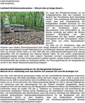 Im Zuge des Pfingsthochwassers ist die Fußgängerbrücke über den Lochbach im Bereich des Tennisheims stark beschädigt worden. Eine anstehende Brückenprüfung ergab, dass eine Instandsetzung der festgestellten Schäden technisch nur mit erhöhtem Aufwand möglich und in Hinblick auf die Schädigung sowie das Bauwerksalter nicht wirtschaftlich ist. Die Brücke verbindet das südlich der Brücke gelegene Wohngebiet mit dem Schwimmbad und das nördlich gelegene Wohngebiet mit den Tennisplätzen. Zudem wird diese von vielen Spaziergängern genutzt.