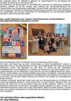 Das Buch „Der beste Tag von allen. Erinnerungen an meine Grundschulzeit“ konnte in gebundener Form in den Räumlichkeiten des Trau- und Empfangssaales der Gemeinde Ensdorf präsentiert werden. Das Besondere an dem Buch: Es wurde von den ehemaligen Viertklässlerinnen und Viertklässlern im Rahmen der Betreuung in der FGTS Ensdorf und in Zusammenarbeit mit der Buchautorin Tanja Karmann und den Gruppenerzieherinnen Naima Debold, Kerstin Wojtek und Annamaria Raffaele geschrieben und gestaltet. Inhalt des Buches ist eine Sammlung von selbst geschriebenen Kurzgeschichten der insgesamt 13 Schülerinnen und Schüler, die mit einer bunten Mischung aus Fantasie und Realität vom Schulalltag der Kinder erzählen.