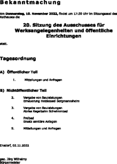 Am Donnerstag, 10. November 2022, findet um 17:30 Uhr im Sitzungssaal des Rathauses die