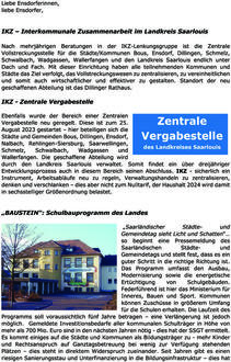 Ebenfalls wurde der Bereich einer Zentralen Vergabestelle neu geregelt. Diese ist zum 25. August 2023 gestartet – hier beteiligen sich die Städte und Gemeinden Bous, Dillingen, Ensdorf, Nalbach, Rehlingen-Siersburg, Saarwellingen, Schmelz, Schwalbach, Wadgassen und Wallerfangen. Die geschaffene Abteilung wird durch den Landkreis Saarlouis verwaltet. Somit findet ein über dreijähriger Entwicklungsprozess auch in diesem Bereich seinen Abschluss. IKZ - sicherlich ein Instrument, Arbeitsabläufe neu zu regeln, Verwaltungshandeln zu zentralisieren, denken und verschlanken – dies aber nicht zum Nulltarif, der Haushalt 2024 wird damit in sechsstelliger Größenordnung belastet.