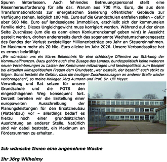 „Wir wünschen uns ein klares Bekenntnis für eine schlüssige Offensive zur Stärkung der Kommunalfinanzen. Dazu gehört auch eine Zusage des Landes, bundespolitisch keine weiteren neuen Vereinbarungen zu Lasten der Kommunen mitzutragen und landespolitisch zum Beispiel bei aktuellen klimapolitischen Fragen dem Grundsatz „wer bestellt, der bezahlt“ auch strikt zu folgen. Sonst besteht die Gefahr, dass die heutigen Zuschusszusagen an anderer Stelle wieder verlorengehen", so meine Kollegen Jörg Aumann und Prof. Dr. Ulli Meyer.