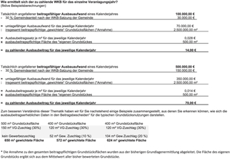 Der errechnete Beitragssatz wird anschließend mit Ihrer beitragspflichtigen Grundstücksfläche multipliziert und ergibt die Beitragslast eines Kalenderjahres. Zur besseren Darstellung wird auf die veröffentlichten fiktiven Beispielrechnungen verwiesen.