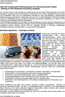 Die Wärmeplanung bildet die Grundlage für die Umstellung auf CO2-neutrale Heizsysteme und zeigt auf, welche klimafreundlichen Lösungen künftig in den jeweiligen Gebäuden und Quartieren umgesetzt werden können. Damit wird ein wichtiger Schritt in Richtung nachhaltiger Energieversorgung und Klimaschutz in unserer Gemeinde gemacht.