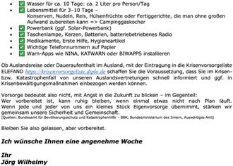 Diese Aufzählung soll dabei keine Sorgen auslösen, sondern verdeutlichen: Vorsorge ist gesunder Menschenverstand. Sie hilft, in außergewöhnlichen Situationen wie beispielsweise einem Blackout oder einem partiellen längeren Stromausfall, einem Unwetter oder anderen Störungen, ruhig zu bleiben und handlungsfähig zu sein.