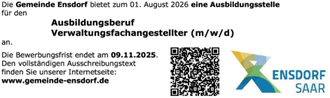 Die Gemeinde Ensdorf bietet zum 01. August 2026 eine Ausbildungsstelle