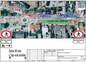 Die Oberflächen der Bürgersteige sind noch nicht vollständig verfugt und werden im Anschluss abgerüttelt. Kehrgut (Rheinsand) wird nach und nach eingekehrt und vollständig beseitig. Die Straßenquerungen und Flächen, welche mit Verbundsteinen provisorisch geschlossen wurden, werden nach und nach asphaltiert. Je nach Witterung können sich die oben genannten Arbeiten verschieben.
