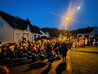 Zu Ehren des heiligen Sankt Martin, der ein barmherziger Mensch war und sein Gewand mit armen Menschen teilte, begingen die Ensdorfer Kinder am vergangenen Montag gemeinsam mit ihren Eltern den Martinstag. Nach dem Wortgottesdienst in der Kirche, der den Kindern die Geschichte eines der bekanntesten Heiligen der Katholischen Kirche nähergebracht hatte, führte der heilige Sankt Martin mit seinem Ross, das den Beginn des Umzugs nicht abwarten konnte (und das bitte ich ausdrücklich zu entschuldigen), die Kinderschar im Schein ihrer Laternen und Fackeln in Richtung Martinsfeuer. Gemeinsam mit den Musikanten des Musikvereins „Harmonie“ aus Roden und unter Beaufsichtigung unserer Feuerwehr, zogen die Kinder singend zur Großsporthalle, wo bereits das Feuer lichterloh brannte. Dort angekommen erhielten die Kinder und Jugendlichen von den fleißigen Helferinnen und Helfern der KiTa und Grundschule Ensdorf die von der Gemeinde gespendeten Martinsbrezeln. Viele Kinder nutzten mit Freude die Gelegenheit, ein gemeinsames Foto mit St. Martin und seinem Pferd neben dem Martinsfeuer zu machen. Die Musikerinnen und Musiker spielten noch einige Martinslieder, während die Kinder ihre Martinsbrezeln verspeisten und die Älteren das kulinarische Angebot der einheimischen Anbieter nutzten.