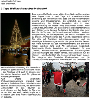 Zum ersten Mal findet unser alljährlicher Weihnachtsmarkt an zwei Tagen statt - zwei Tage voll vorweihnachtlicher Stimmung. Ich freue mich sehr, dass sich die teilnehmenden Vereine und Privatpersonen, die alljährlich an unserer Veranstaltung die Hütten bespielen, sich in einer Vorbesprechung für diesen Weg entschieden haben. Mehr Zeit für Besucherinnen und Besucher des Weihnachtsmarktes zum Stöbern, eine bessere Auslastung der Stände oder mehr Zeit für die Vereine, die Vereinskasse aufzufüllen … sind nur einige Gründe, die dafürsprachen, den Ansatz in diesem Jahr zu ändern. Am Wochenende des 7. und 8. Dezembers können Sie sich auf festlichen Adventsbudenzauber und ein vielfältiges Rahmenprogramm für die ganze Familie freuen. Für viele Familien ist der Weihnachtsmarkt ein beliebtes Ritual, welches Jung und Alt gemeinsam begeistert. Traditionelle Musik, Basteleien und Leckereien für uns „Große“; Kinderschminken, gemeinsames Stockbrotgrillen und das Highlight des letzten Jahres, das Eselreiten, für die Kleinen - wird hoffentlich alle Herzen höherschlagen lassen. Die Jüngsten des Ensdorfer Kindergartens und die Grundschulkinder sorgen mit ihren Liedern und Gedichten für weihnachtliche Stimmung. Ein besonderer Ehrengast darf natürlich auch nicht fehlen – der Nikolaus wird auch in diesem Jahr die Kinder besuchen und für glänzende Kinderaugen sorgen.
