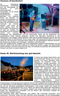 Am vergangenen Wochenende verwandelte sich der Sitzungssaal der Gemeinde in einen stimmungsvollen Konzertsaal, als die beiden saarländischen Mundartkünstler Edwin Bohlinger und Johannes Berrar das Publikum mit Liedern und Geschichten aus der Region begeisterten. Der Raum war gut gefüllt und die Vorfreude war förmlich spürbar, noch bevor die ersten Klänge durch den Raum hallten. Die Stimmung im Saal war geprägt von Herzlichkeit und es entstand schnell eine vertraute Atmosphäre. Die authentischen und oft humorvollen Texte, die die Eigenheiten der saarländischen Kultur liebevoll aufgreifen, schufen eine besondere Verbindung zu den Zuhörenden. Vom hiesigen „Monte Schlacko“ (das Lied hat großes Potenzial) ging es über die „Hochzeitsimmes im Hiehnerecken“ bis hin zu den „Jäbs“, die wahrscheinlich jeder von uns mal zitiert hat. Mit viel Humor und einem feinen Gespür für die saarländische Lebensart brachten die Künstler das Publikum zum Mitwippen, -klatschen und Schmunzeln.