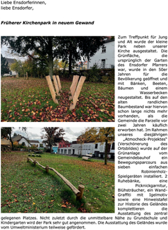 Zum Treffpunkt für Jung und Alt wurde der kleine Park neben unserer Kirche ausgestaltet. Die Grünfläche, die ursprünglich der Garten des Ensdorfer Pfarrers war, wurde in den 50er Jahren für die Bevölkerung geöffnet und mit Bänken, Beeten, Bäumen und einem Wasserbecken neugestaltet. Bis auf den alten randlichen Baumbestand war hiervon schon lange nichts mehr vorhanden, als die Gemeinde die Parzelle vor zwei Jahren käuflich erworben hat. Im Rahmen unseres diesjährigen „Atmocheck-Projektes“ (Verschönerung des Ortsbildes) wurde auf der Grünanlage vom Gemeindebauhof ein Bewegungsparcours aus sieben einfachen Robinienholz-Spielgeräten installiert. 2 Ruhebänke, eine Picknickgarnitur, Blühsträucher, ein Wand-Graffiti mit Igelmotiv sowie eine Hinweistafel zur Historie des Geländes komplettieren die Ausstattung des zentral gelegenen Platzes. Nicht zuletzt durch die unmittelbare Nähe zu Grundschule und Kindergarten wird der Park sehr gut angenommen. Die Ausstattung des Geländes wurde vom Umweltministerium teilweise gefördert.