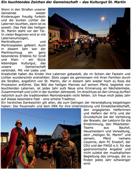Wenn in den Straßen unserer Gemeinde wieder Kinderaugen freudig funkeln und die bunten Lichter der Laternen leuchten, dann ist es soweit: Das Fest des heiligen St. Martin steht vor der Tür. In vielen Regionen wird er mit Laternenumzügen, Martinsfeuern und Martinsspielen gefeiert. Auch in diesem Jahr war der Martinsumzug ein ganz besonderes Erlebnis für Groß und Klein – ein Stück lebendiges Kulturgut, das unsere Gemeinschaft verbindet. Mit viel Liebe und Kreativität haben die Kinder ihre Laternen gebastelt, die im Schein der Fackeln und Lichter wunderschön erstrahlten. Stolz zogen sie gemeinsam mit ihren Familien durch die Straßen, angeführt von St. Martin, der in diesem Jahr wieder hoch zu Ross die Prozession anführte. Das Bild des heiligen Mannes auf seinem Pferd, begleitet von leuchtenden Laternen, ist jedes Jahr aufs Neue eine Erinnerung an Nächstenliebe, Zusammenhalt und Licht in der dunklen Jahreszeit. Im Anschluss an den Umzug durften natürlich auch die traditionellen Martinsbrezeln nicht fehlen. Ich freue mich jedes Jahr auf dieses besondere Fest - eine schöne Tradition.