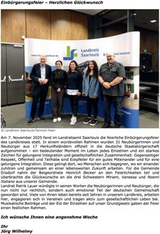 Am 7. November 2025 fand im Landratsamt Saarlouis die feierliche Einbürgerungsfeier des Landkreises statt. In einem würdevollen Rahmen wurden 31 Neubürgerinnen und Neubürger aus 17 Herkunftsländern offiziell in die deutsche Staatsbürgerschaft aufgenommen – ein bedeutender Moment im Leben jedes Einzelnen und ein starkes Zeichen für gelungene Integration und gesellschaftlichen Zusammenhalt. Gegenseitiger Respekt, Offenheit und Teilhabe sind Eckpfeiler für ein gutes Miteinander und für eine gelungene Integration. Diese gelingt dort, wo Menschen sich begegnen, wo wir einander zuhören und gemeinsam an einer lebenswerten Zukunft arbeiten. Für die Gemeinde Ensdorf nahm der Beigeordnete Heinrich Becker an den Feierlichkeiten teil und überbrachte die Glückwünsche an die drei Schwestern Miriam, Vanessa und Noemi Italiano aus unserer Gemeinde.
