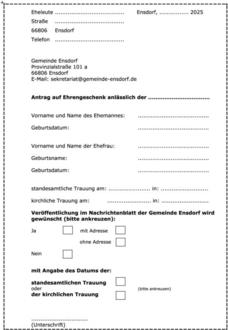 Die Gemeinde Ensdorf möchte auch im kommenden Jahr wieder den Ehejubilaren gratulieren, die ihre Goldene Hochzeit (50 Ehejahre), Diamantene Hochzeit (60 Ehejahre), Eiserne Hochzeit (65 Ehejahre) oder Gnadenhochzeit (70 Ehejahre) feiern.