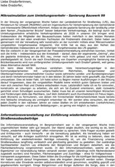 Ich kann diese Kritik durchaus verstehen: Viele Verantwortungsträger in den Kommunalparlamenten mit unterschiedlichen Mehrheiten, Bürgermeister und Oberbürgermeister unterschiedlicher Couleur sowie zahlreiche Landes- und Bundesregierungen und deren Verkehrsminister haben es in den letzten 30 Jahren leider nicht geschafft, das Projekt umzusetzen. Dies ist leider Fakt. Ich habe schon zu Beginn meiner Ausführungen in der Sitzung darauf hingewiesen, dass die vorgestellten Modelle keine wirklich guten Optionen bieten und man sich zwischen Pest und Cholera entscheiden muss. Letztendlich halte ich es für sinnvoller, konstruktiv an Lösungen zu arbeiten, die sich am Ist-Zustand orientieren, statt rückwärts gerichtet einen Schuldigen auszumachen. Dabei muss bei all unseren berechtigten Wünschen und Forderungen stets das Machbare, (auf dem Zeitstrahl) auch Durchsetzbare im Fokus liegen, statt Wünsche zu formulieren, von denen mit hinreichender Wahrscheinlichkeit heute bereits ihre faktische Umsetzung als unmöglich erkennbar ist. Wir werden alles versuchen, die ohne jeden Zweifel in den nächsten Jahren an vielen Stellen im Ort entstehenden (verkehrlichen) Beeinträchtigungen -und ja auch Belästigungen-, so gering wie möglich zu halten.