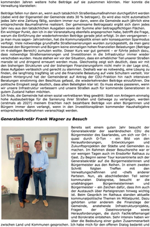 Ich finde, die Gemeinde hat einen sozial vertretbaren Weg gewählt: Statt von Anliegern einmalig hohe Ausbaubeiträge für die Sanierung ihrer Straßen und Gehwege zu verlangen, werden (erstmals ab 2027) meinem Erachten nach bezahlbare Beiträge von allen Bürgerinnen und Bürgern immer dann verlangt, wenn in den Investitionsplänen kommender Haushaltsjahre entsprechende Maßnahmen veranschlagt werden.