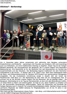 Am 4. Dezember jeden Jahres versammeln sich zahlreiche dem Bergbau verbundene Ensdorferinnen und Ensdorfer – gemeinsam mit Freunden aus Griesborn, Elm und neuerdings auch aus Köllerbach, um ihren traditionellen Feiertag zu begehen. Dieser Tag ist der heiligen Barbara gewidmet, der Schutzpatronin der Bergleute, die in unserer Region eine besondere Bedeutung hat. Ihre Geschichte ist für die Menschen hier seit Generationen ein Symbol des Zusammenhalts und des Glaubens. Der Barbaratag beginnt traditionell mit dem feierlichen Gottesdienst in der Kirche – in diesem Jahr in St. Josef in Elm. Nach dem Gottesdienst hatte der Berg- und Hüttenarbeiterverein St. Barbara 1873 Ensdorf zum gemeinsamen Mittagessen eingeladen. Für die musikalische Umrahmung sorgte in diesem Jahr der Verein der Musikfreunde 1920 Bous e.V. Der Barbaratag ist weit mehr als ein nostalgisches Fest. Er erinnert uns an die Wurzeln unserer Region und die Menschen, die sie geprägt haben - die Bergleute. Gleichzeitig ist er ein Tag der Gemeinschaft, an dem sich alle Generationen treffen, um diese Werte zu feiern und weiterzugeben. Es liegt an uns, diese Tradition zu erhalten und an die kommenden Generationen weiterzugeben, damit die Geschichte und Symbolik der heiligen Barbara auch in Zukunft Teil unseres Gemeindelebens bleibt. Darüber hinaus wurden zahlreiche Mitglieder der IGBCE teilweise für Mitgliedschaften von 25 bis 75 Jahre in der Gewerkschaft geehrt.