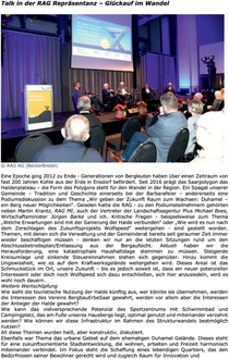 Wie kann das vielversprechende Potenzial des Sportzentrums mit Schwimmbad und Campingplatz, das am Fuße unseres Hausbergs liegt, optimal genutzt und miteinander verzahnt werden? Wie können wir diese Infrastruktur im Rahmen des Strukturwandels bestmöglich nutzen?