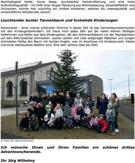 Adventszeit – einer meiner schönsten Termine in dieser Zeit ist das Tannenbaumschmücken mit den Kindergartenkindern. Ich freue mich jedes Jahr auf die vielen kleinen fleißigen Helferinnen und Helfer aus dem Kindergarten, die den Weihnachtsbaum vor der Repräsentanz auf dem RAG-Gelände schmücken. Lautes Lachen und viele aufgeregte Mädchen und Jungen schmücken fleißig den Baum mit bunten Kugeln, was im Anschluss mit Kinderpunsch, Kakao und einer Nikolaustüte belohnt wird. Eine sehr schöne Idee der RAG.
