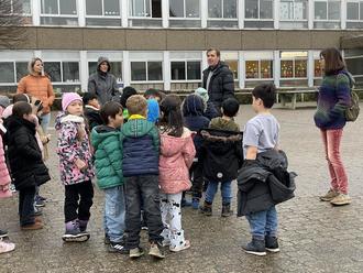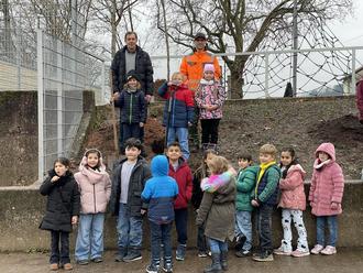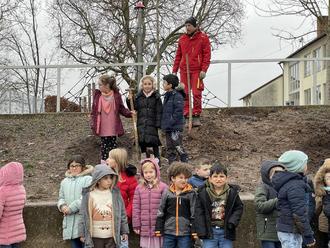 Direkt vor Ort, im Randbereich des Schulhofes, wurden vergangene Woche die diesjährigen „Klassenbäume“ unserer Schulneulinge gepflanzt. Die drei Blumeneschen setzten die 58 Mädchen und Jungen bei regnerisch-mildem Wetter gemeinsam mit Bürgermeister Jörg Wilhelmy und den Klassenlehrerinnen Ekaterina Sauer (Bienenklasse), Tina Kettenhofen (Tigerklasse) und Katarina Kleer (Pandaklasse) in den Hang des unteren Schulhofes. Die Pflanzgruben hatten die Gemeindegärtner zuvor ausgehoben, und Spaten und Gießkannen für die kleinen Gärtner bereitgestellt.