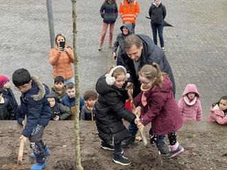 Zunächst jedoch begrüßte Jörg Wilhelmy die Kinder herzlich zu der mittlerweile 12. Baumpflanzung der Grundschule. Anschließend griff er gemeinsam mit den Erstklässlern zum Spaten, um die Hochstämme, die mit etwa 8 Metern Endhöhe zu den Kleinbäumen zählen, einzupflanzen.