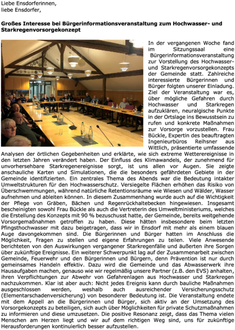 In der vergangenen Woche fand im Sitzungssaal eine Bürgerinformationsveranstaltung zur Vorstellung des Hochwasser- und Starkregenvorsorgekonzepts der Gemeinde statt. Zahlreiche interessierte Bürgerinnen und Bürger folgten unserer Einladung. Ziel der Veranstaltung war es, über mögliche Gefahren durch Hochwasser und Starkregen aufzuklären, neuralgische Punkte in der Ortslage ins Bewusstsein zu rufen und konkrete Maßnahmen zur Vorsorge vorzustellen. Frau Bückle, Expertin des beauftragten Ingenieurbüros Reihsner aus Wittlich, präsentierte umfassende Analysen der örtlichen Gegebenheiten und erklärte, wie sich extreme Wetterereignisse in den letzten Jahren verändert haben. Der Einfluss des Klimawandels, der zunehmend für unvorhersehbare Starkregenereignisse sorgt, ist uns allen vor Augen. Sie zeigte anschauliche Karten und Simulationen, die die besonders gefährdeten Gebiete in der Gemeinde identifizierten. Ein zentrales Thema des Abends war die Bedeutung intakter Umweltstrukturen für den Hochwasserschutz. Versiegelte Flächen erhöhen das Risiko von Überschwemmungen, während natürliche Retentionsräume wie Wiesen und Wälder, Wasser aufnehmen und ableiten können. In diesem Zusammenhang wurde auch auf die Wichtigkeit der Pflege von Gräben, Bächen und Regenrückhaltebecken hingewiesen. Insgesamt bescheinigten sowohl Frau Bückle als auch die Vertreterin des Umweltministeriums, welches die Erstellung des Konzepts mit 90 % bezuschusst hatte, der Gemeinde, bereits weitgehende Vorsorgemaßnahmen getroffen zu haben. Diese hätten insbesondere beim letzten Pfingsthochwasser mit dazu beigetragen, dass wir in Ensdorf mit mehr als einem blauen Auge davongekommen sind. Die Bürgerinnen und Bürger hatten im Anschluss die Möglichkeit, Fragen zu stellen und eigene Erfahrungen zu teilen. Viele Anwesende berichteten von den Auswirkungen vergangener Starkregenfälle und äußerten ihre Sorgen über zukünftige Ereignisse. Ein weiterer Schwerpunkt lag auf der Zusammenarbeit zwischen Gemeinde, Feuerwehr und den Bürgerinnen und Bürgern, denn Prävention ist nur durch gemeinsames Handeln effektiv. Dazu wird die Gemeinde und das Abwasserwerk ihre Hausaufgaben machen, genauso wie wir regelmäßig unsere Partner (z.B. den EVS) anhalten, ihren Verpflichtungen zur Abwehr von Gefahrenlagen aus Hochwasser und Starkregen nachzukommen. Klar ist aber auch: Nicht jedes Ereignis kann durch bauliche Maßnahmen ausgeschlossen werden, weshalb auch ausreichender Versicherungsschutz (Elementarschadenversicherung) von besonderer Bedeutung ist. Die Veranstaltung endete mit dem Appell an die Bürgerinnen und Bürger, sich aktiv an der Umsetzung des Vorsorgekonzepts zu beteiligen, sich auch über Möglichkeiten für private Schutzmaßnahmen zu informieren und diese umzusetzen. Die positive Resonanz zeigt, dass das Thema vielen Menschen am Herzen liegt und wir auf dem richtigen Weg sind, uns für zukünftige Herausforderungen kontinuierlich besser aufzustellen.