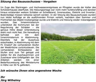 Im Zuge des Starkregen- und Hochwasserereignisses an Pfingsten wurde der Keller des Schützenhauses überflutet. Die Heizungsanlage war nicht mehr funktionsfähig und darüber hinaus entstanden weitere Schäden an Schießstand, Innenausbau, Elektrik und Inventar; Bodenbeläge müssen teilweise saniert werden. In der Sitzung des Bauausschusses wurden nun letzte Aufträge an die ausführenden Firmen verteilt, nachdem über Sommer und Frühherbst das Objekt trockengelegt wurde und Elektrik und Heizung wieder instandgesetzt wurden. Das Innenministerium unterstützt die Kommunen bei der Regulierung der Schäden – die genaue Höhe dieser Unterstützung steht noch nicht fest. Die Verwaltung befindet sich mit dem Innenministerium in Abstimmung. Ebenfalls hat der Ausschuss entschieden, in Abstimmung mit dem FC Ensdorf die vorhandenen Stufen der Westtribüne zurückzubauen. Die vorhandenen Einfasssteine der Stufen sind zum Teil gekippt und stellen für die Zuschauerinnen und Zuschauer eine Unfallgefahr dar. Die Arbeiten werden mit einer Bedarfszuweisung des Ministeriums in Höhe von 50 % gefördert.