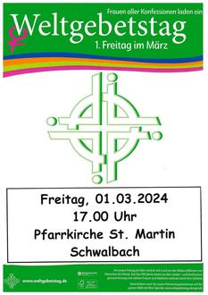 | 17.00 Uhr | Gottesdienst in der Katholischen Kirche St. Martin Schwalbach zum Weltgebetstag |
