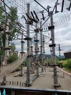 Heute geht es hoch hinaus! Sowohl AnfängerInnen, als auch erfahrenere Kletterer können sich im größten, freistehenden Kletterpark Europas austoben!