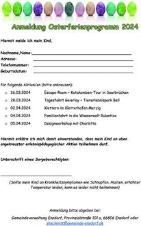 Wie ihr teilnehmen könnt? Sucht euch ein oder mehrere Aktivitäten zusammen mit euren Eltern aus, markiert diese auf dem Anmeldezettel und lasst mir diesen entweder per Email (shschmitt@gemeinde-ensdorf.de) oder im Original zukommen. Gerne könnt ihr euch auch telefonisch bei mir unter der 06831 504-137 anmelden.